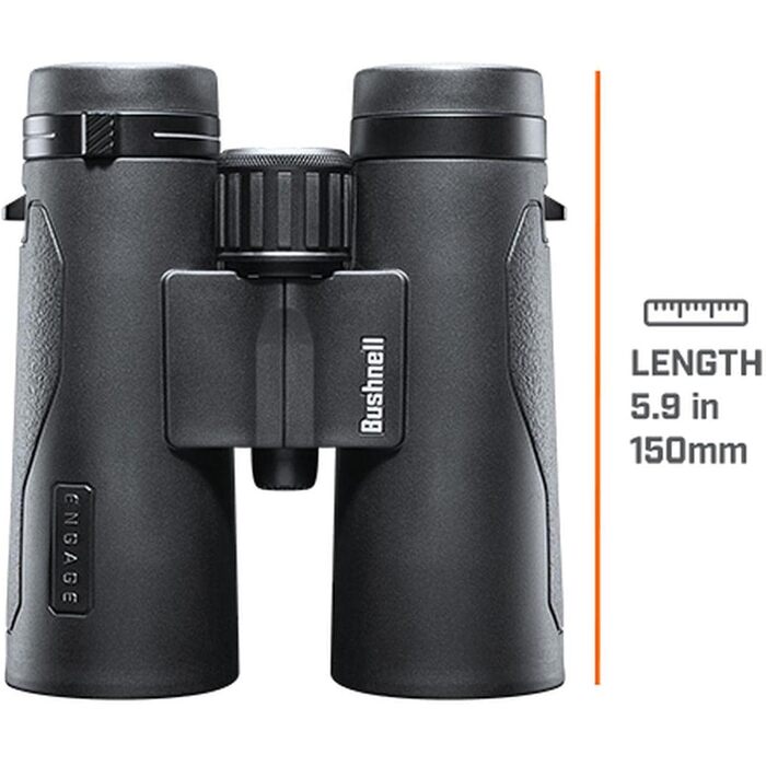 Bushnell 10×42 Engage X Binoculars, in basic black, are ideal for when you’re out birding, hunting, hiking, camping, or enjoying sporting events especially in wide-open spaces where the high magnification really shines. To help deliver its performance, Bushnell binoculars employ anti-reflection multicoatings and protective exterior coatings on the lead-free glass lens with BAK4 glass on the compact roof prisms. The optical coatings work together to maximize light transmission through the light path, resulting in bright, sharp, and clear high-contrast views with accurate color fidelity and crisp resolution, even in challenging conditions such as at dawn and dusk or when viewing across vast wide open spaces. To further improve the observational experience, the Engage X binoculars are designed with a long eye relief and comfortable exit pupils that make looking through them for long periods comfortable with reduced eyestrain. Bushnell built the Engage X binoculars to make them easy and comfortable to hold and allow them to withstand the harshest elements. Their chassis is designed to provide an ergonomic and balanced feel in the hand. The optical tubes are nitrogen filled and O-ring sealed to an IPX7 rating, so they are waterproof and resistant to internal fogging if the weather turns or they take an accidental spill in a stream or puddle. Protecting the optical components is a rubber armor accented with textured palm pads that provide a sure and secure grip. For those who experience fatigue when holding large optics for long periods, or to simply eliminate vibrations, the Engage binoculars can be tripod mounted using an optional adapter for easy hands-free use.