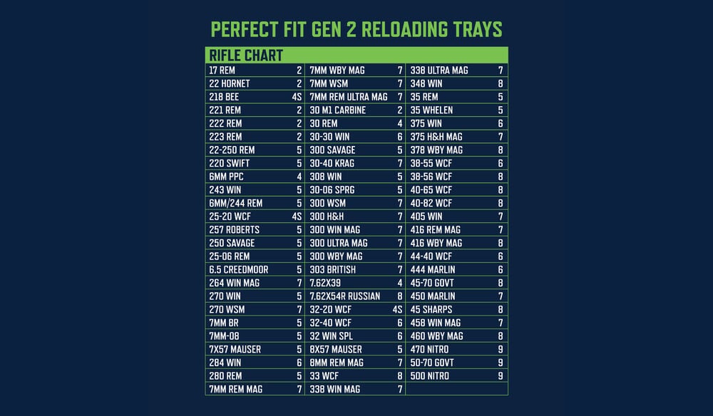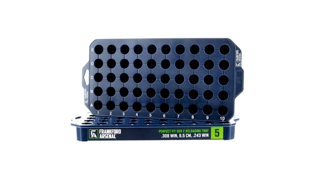 Frankford Arsenal’s Perfect Fit Gen 2 Reloading Trays are sized for individual calibers or a family of calibers for a precise fit. These trays are an essential tool for any reloader to maximize efficiency and stay organized. 9 tray sizes are available for many popular rifle and pistol cartridges. Sold in a convenient 2-pack, each tray securely holds 50 cases.